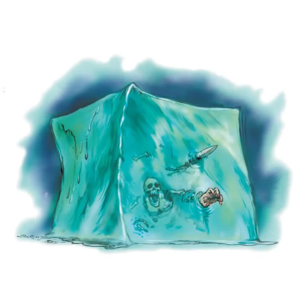 Typically, a gelatinous cube measured between 10 to 15 feet (3 to 4.6 meters) on a side and weighed as much as 50,000 pounds (23,000 kilograms), although legends existed of much larger cubes. The creature was completely transparent, with only a glint of its surface in the light to give away its position. The occasional random object floating in a well fed gelatinous cube’s body could also serve as a warning of its presence to dungeon delvers.