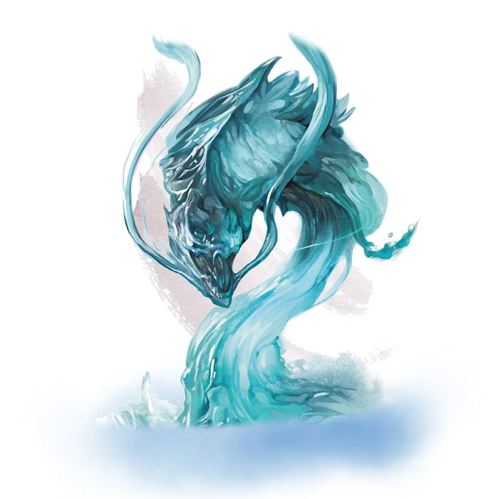 The upper half of a water weird typically appeared like a beautiful, translucent, blue female humanoid composed entirely of water, but the lower half could appear serpentine or like a column of water rising from the pool.